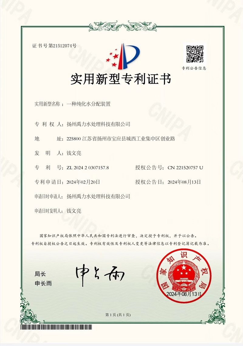 纯化水分配装置专利证书
